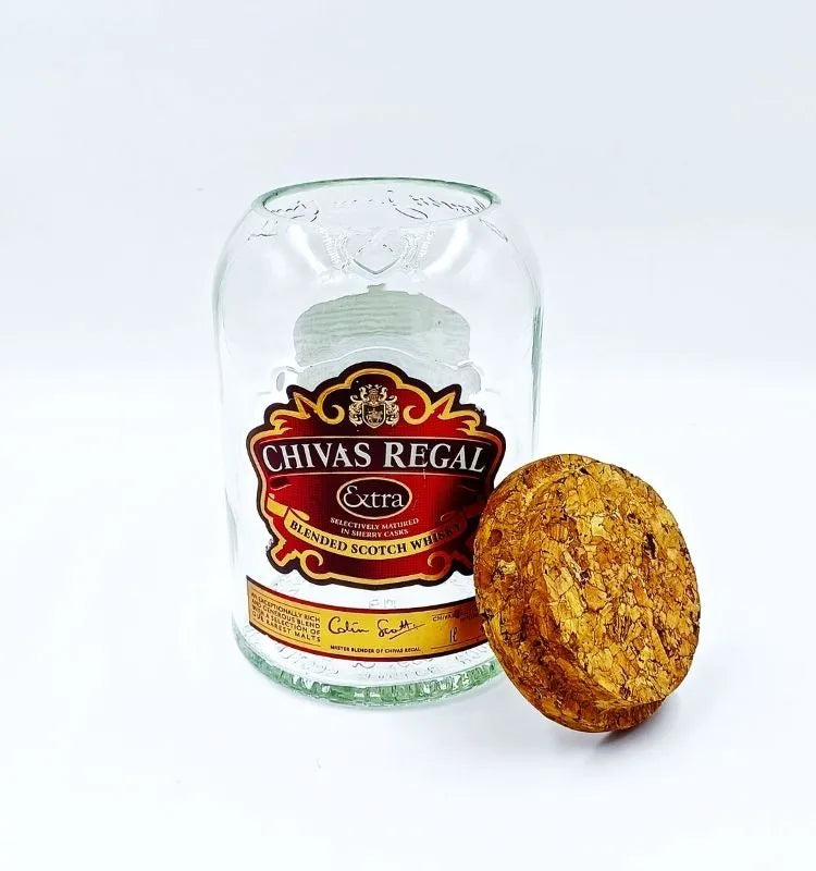 Discover the perfect fusion of sustainability and sophistication with the Krystal Kraft Upcycled Chivas Regal Extra Jar. Skillfully crafted from an authentic 1L Chivas Regal Extra  bottle, this eco-friendly masterpiece transforms a timeless icon into a versatile and luxurious home accessory. Its handcrafted design highlights the original bottle's striking aesthetic while championing environmental responsibility.